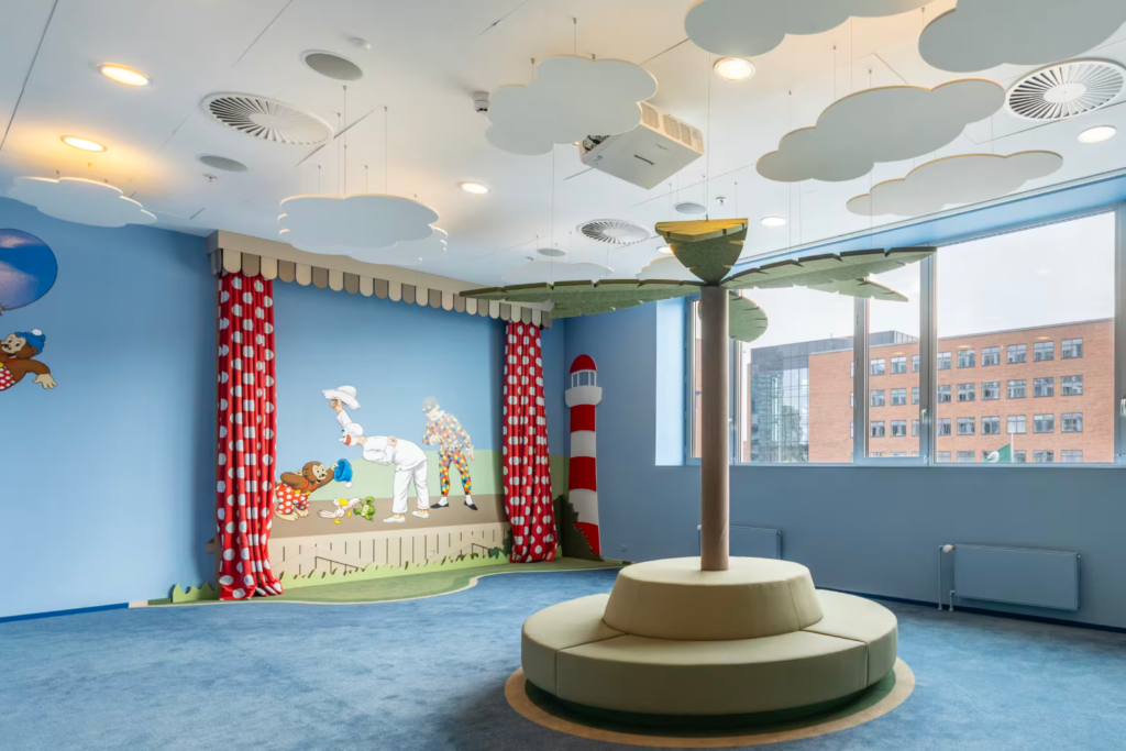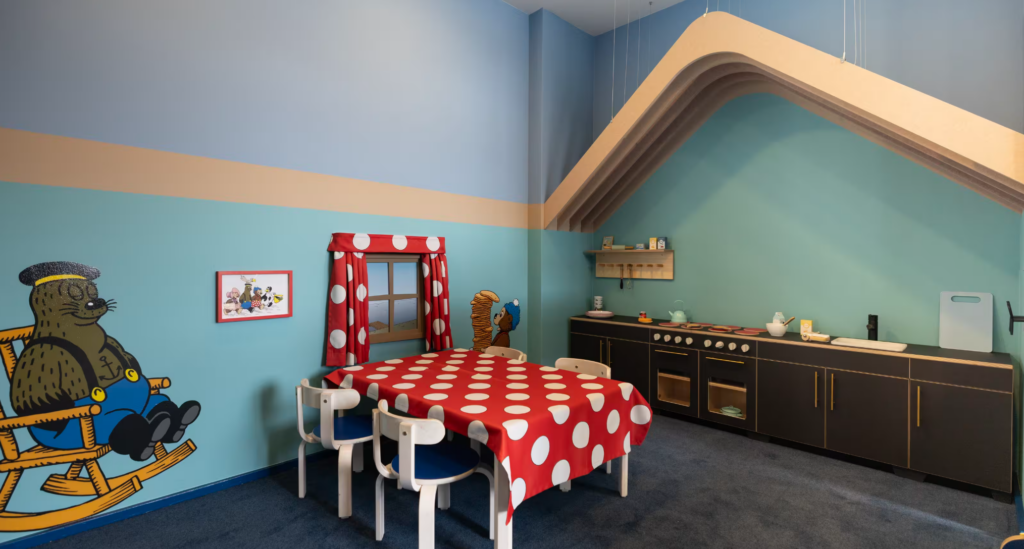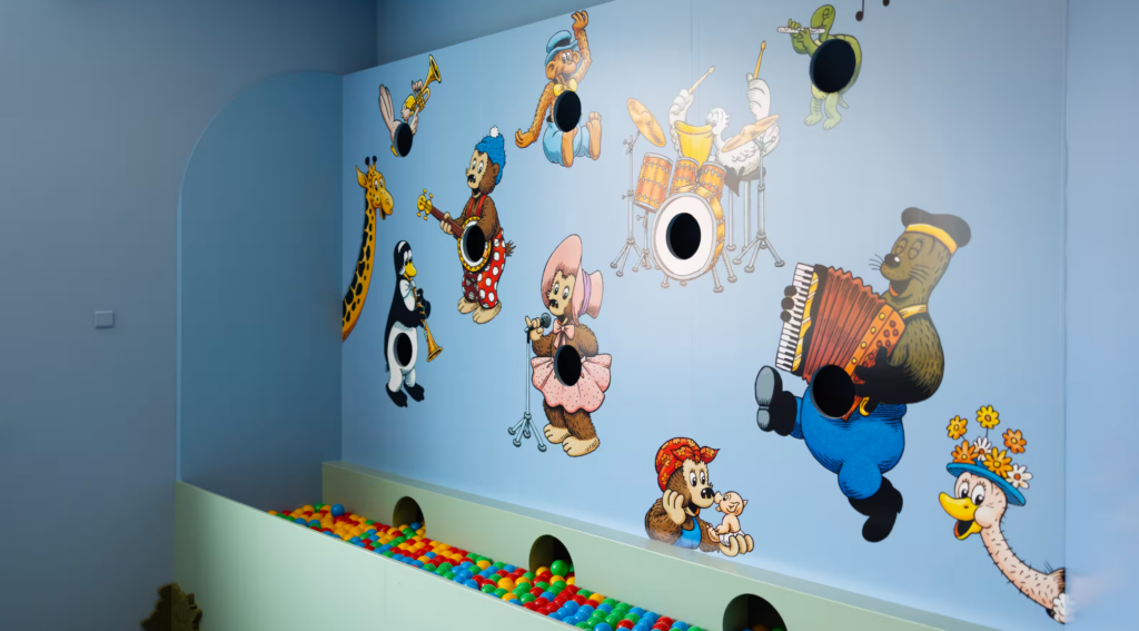 Right next to the room is the Rasmus Klump playroom. The playroom is decorated with the best colors and characters we know from the Rasmus Klump universe: Meet Rasmus, Pingo, Skæg, and Pelle as you try to throw balls through the ball wall, jump on the fun palm island the friends meet on their way – or bake the best Rasmus Klump pancakes in the fine play kitchen.