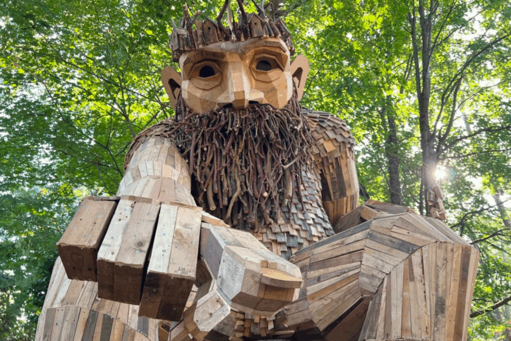 Danish artist Thomas Dambo creates giant troll sculptures from recycled materials to promote sustainability. His works are found worldwide, including Denmark, where his Troll Map helps locate them.