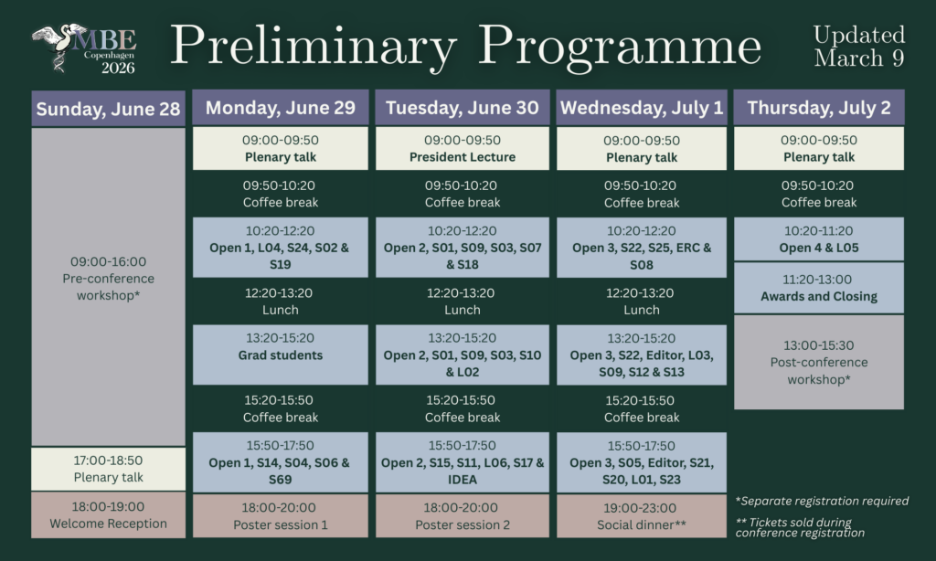 - Attendance to the workshop does not require registration or participation in the SMBE 2026 conference. However, SMBE participants are invited to attend symposium L05 during the conference, which will serve as a preamble to the workshop.
