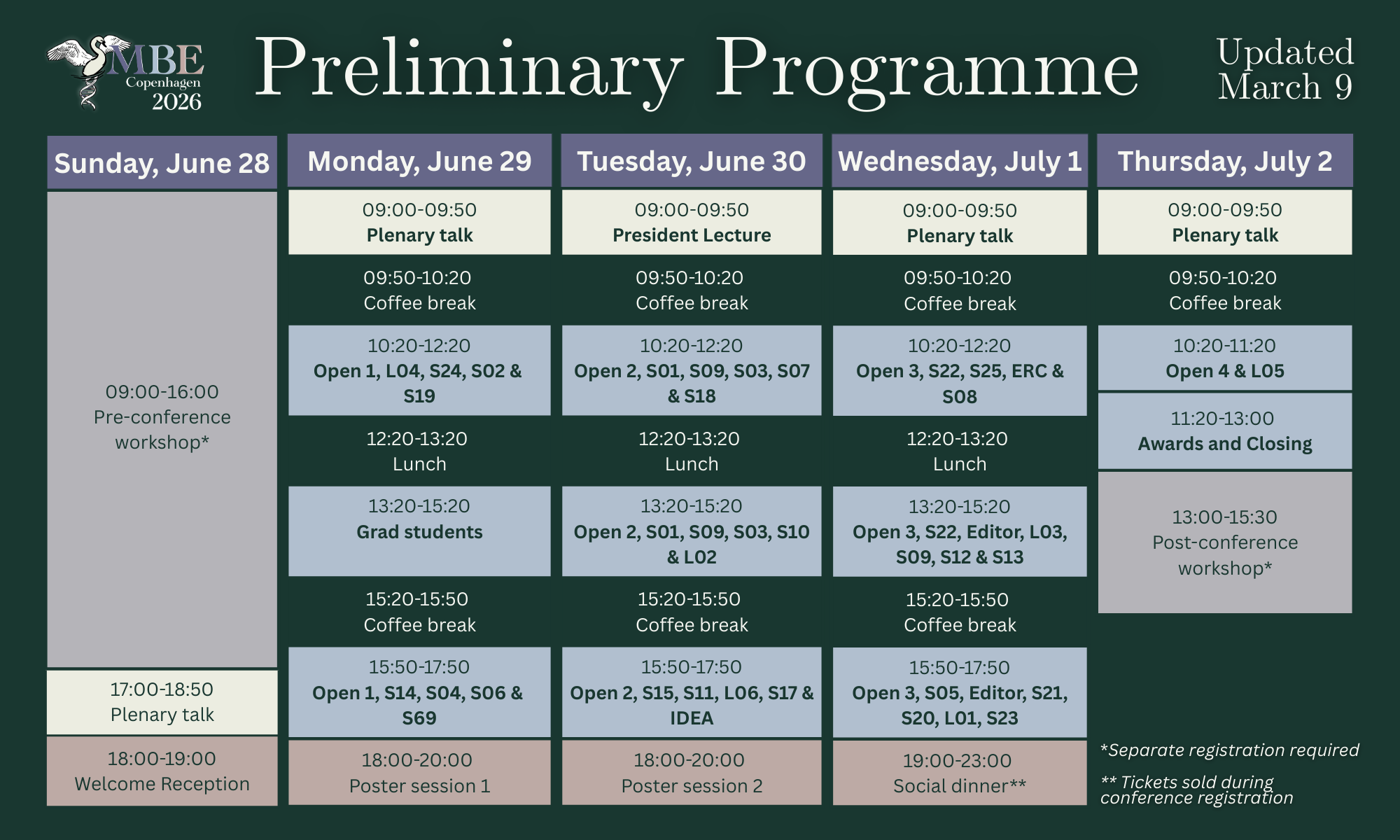 - Registration for the SMBE 2026 conference does NOT include registration for any workshops or events mentioned here.